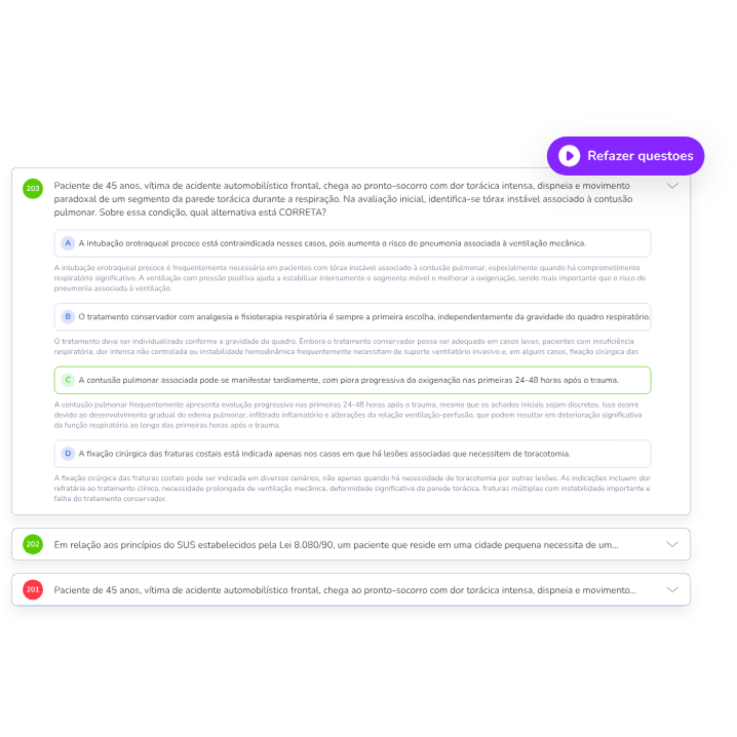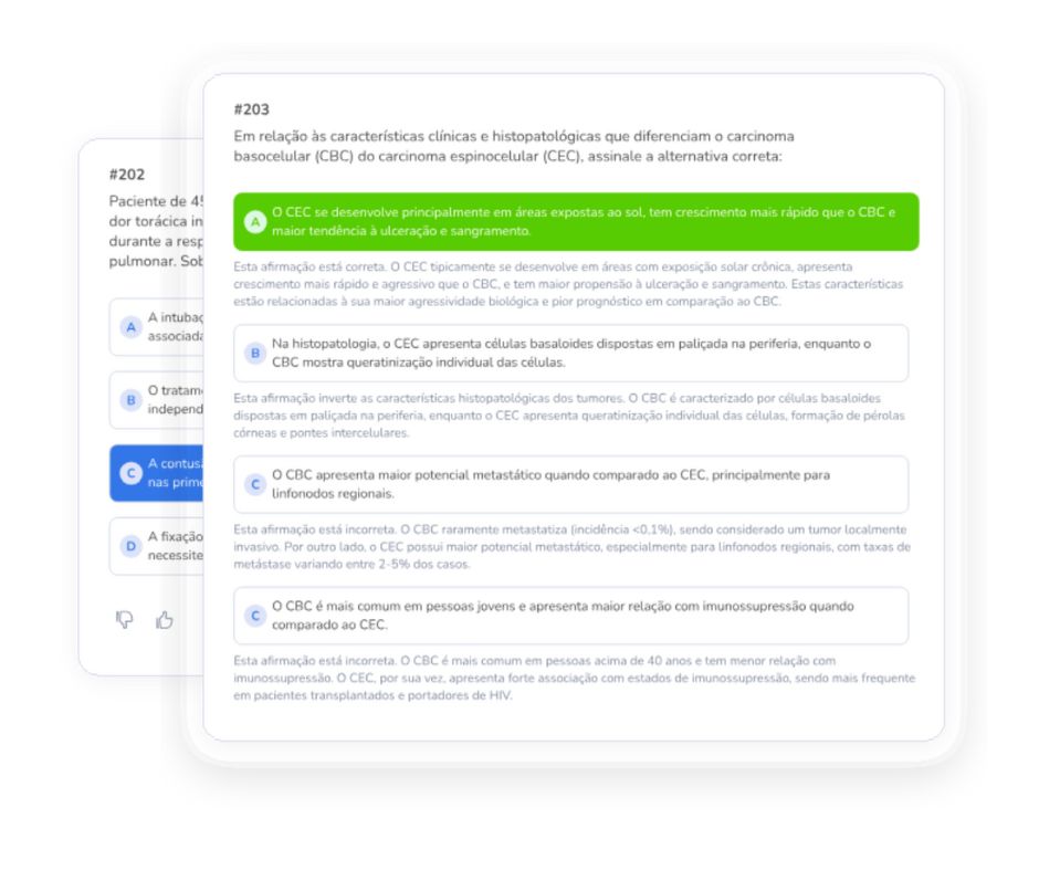 Casos clínicos integrados, alternativas próximas e foco em raciocínio clínico de alta exigência — exatamente como o ENARE cobra.