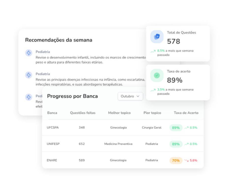 Relatórios inteligentes revelam quantas questões você respondeu, seus acertos, erros e os temas que mais impactam sua nota. Toda semana, a IA te envia recomendações personalizadas para estudar exatamente o que vai te fazer subir de nível. Pare de estudar no escuro. Tenha clareza total sobre seu progresso e use dados reais para conquistar sua vaga na residência.
